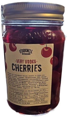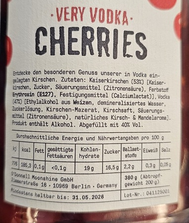 Zutaten: Kaiserkirschen (53%) (Kaiser-kirschen, Zucker, Säuerungsmittel (Zitronensäure), Farbstoff Erythrosin (E127), Festigungsmittel (Calciumlactat)), Vodka (47%) [Ethylalkohol aus Weizen, demineralisiertes Wasser, Zuckerlösung, Kirschen-Mazerat, Kirschsaft, Säuerungs-mittel (Zitronensäure), natürliches Kirsch- & Mandelarome). Produkt enthält Alkohol. Abgefüllt mit 40% Vol.